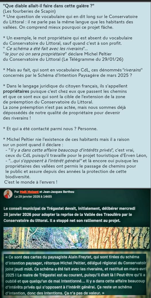 En réalité, pas un seul mètre carré des vallées des Traouïero n’est classé en zone Natura 2000. Présenter le périmètre d’intervention du Conservatoire du littoral comme une simple traduction de Natura 2000 entretient donc une confusion majeure sur la nature du projet.